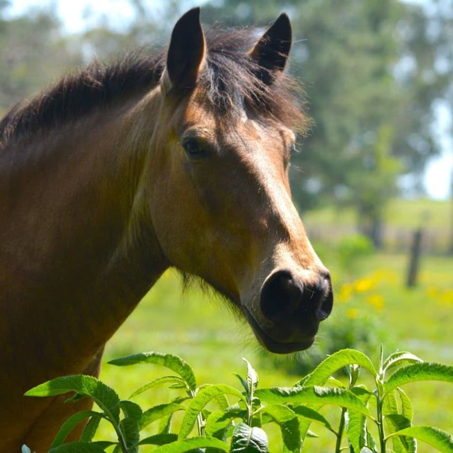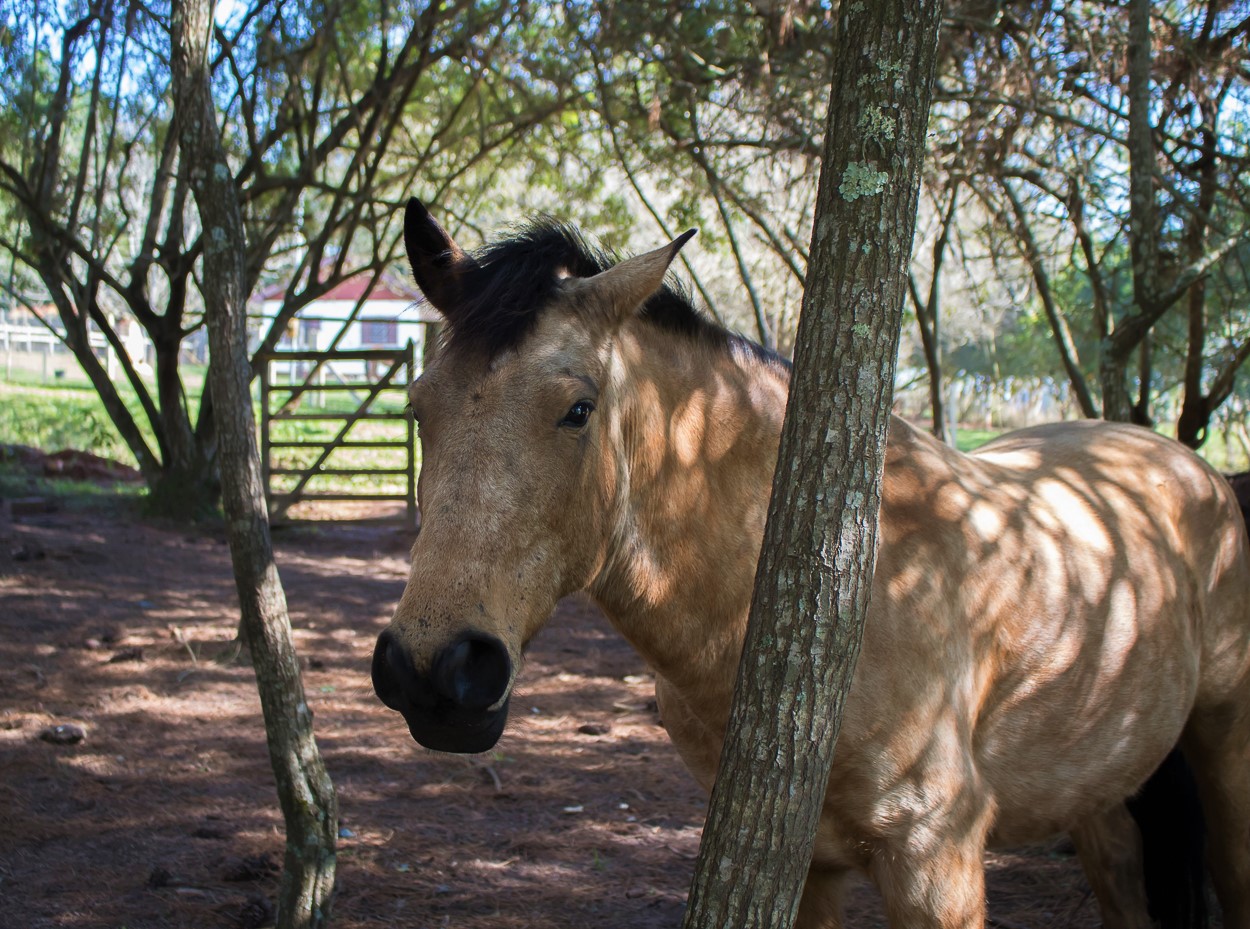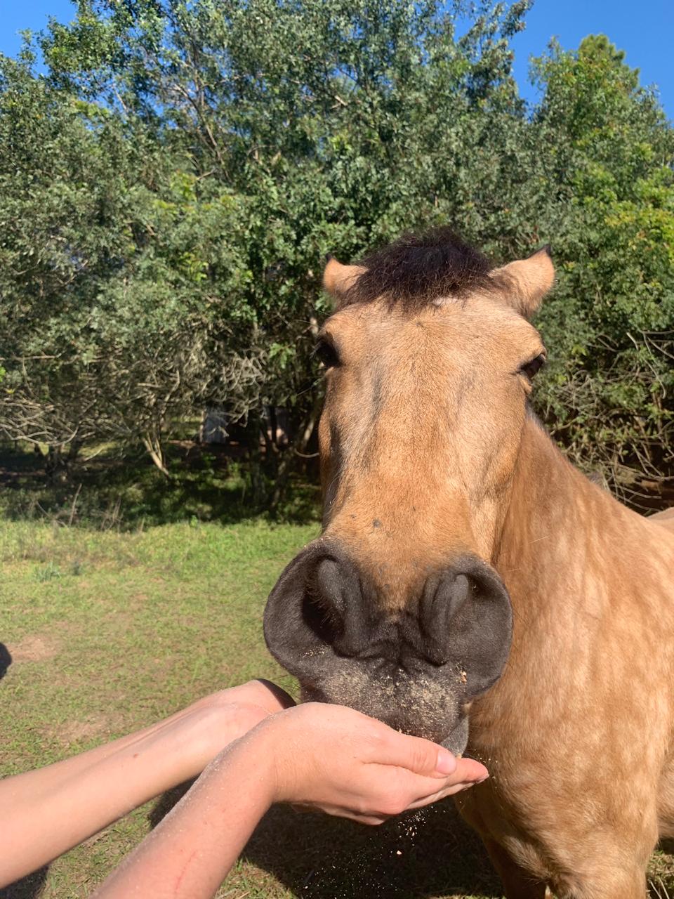 Por ser livre, Baio é daqueles cavalos mais ariscos, e sempre buscamos respeitar suas reações e sentimentos ante a presença humana. Mas é só chegar com um balde de suas comidas preferidas que ele vem correndo comer na nossa mão. Comer na mão de um humano requer muita confiança, e que bom que conseguimos conquistar isso nele.