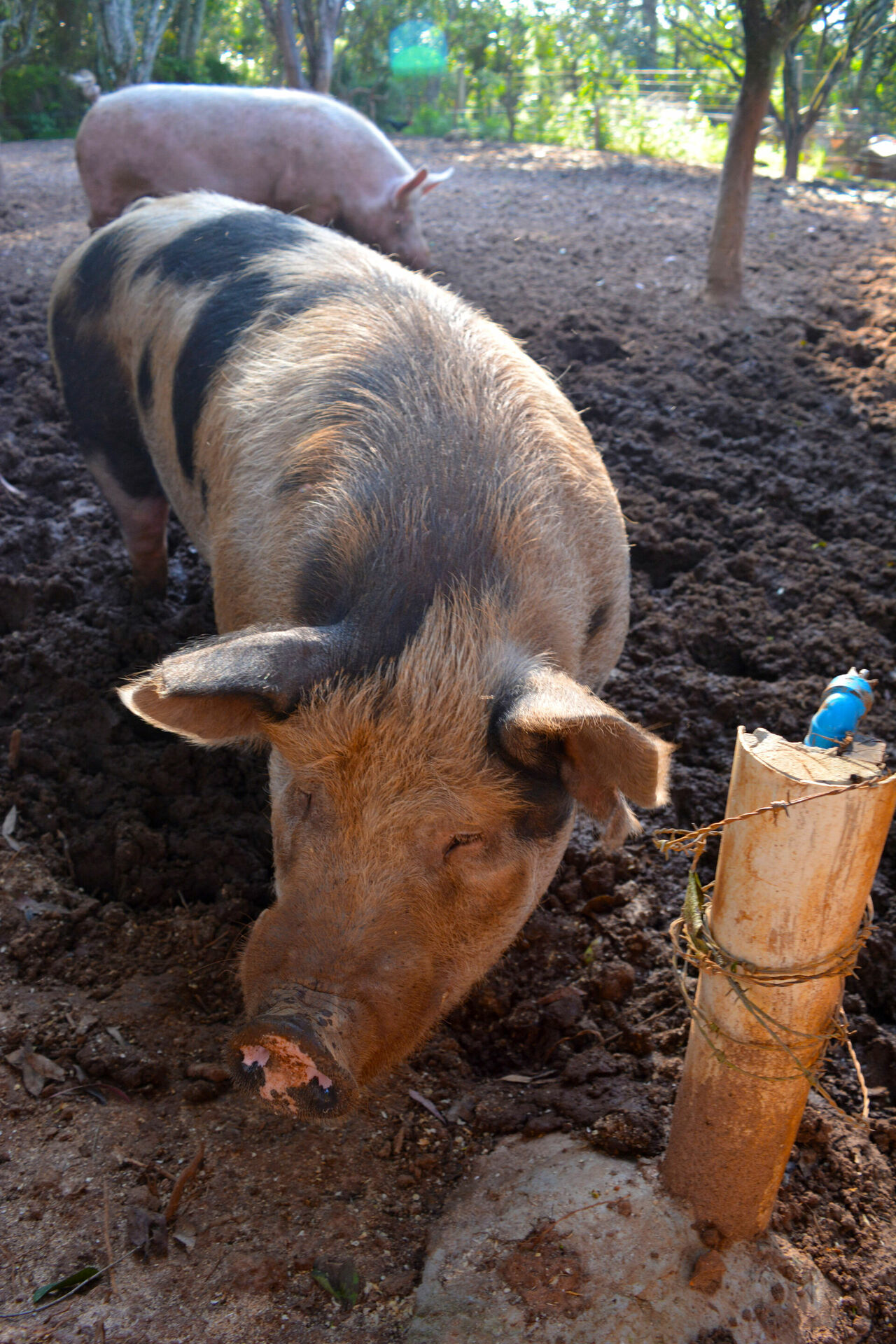 Dos 3 porcos que ocupam o espaço, Jujuba é o mais exibido, adora uma platéia para se jogar na sua piscina de lama.